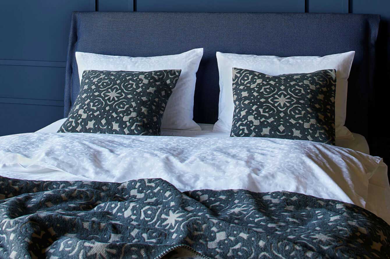 Linge de lit haut de gamme en satin de coton à motif damassé de style papier découpé.