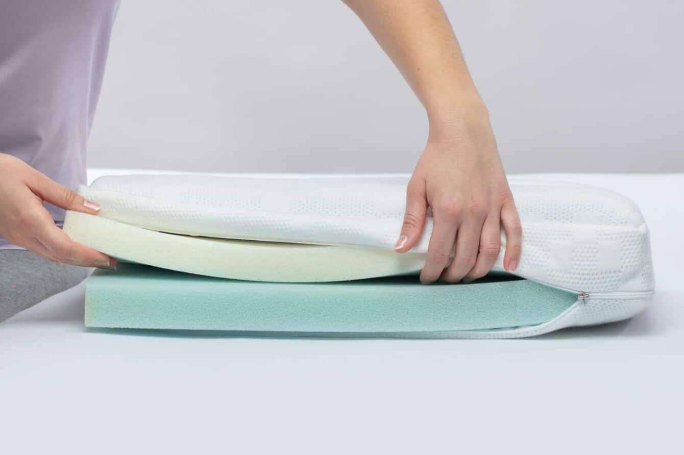 Oreiller de soutien respirant avec zone climatique et mousse gel, hauteur ajustable.