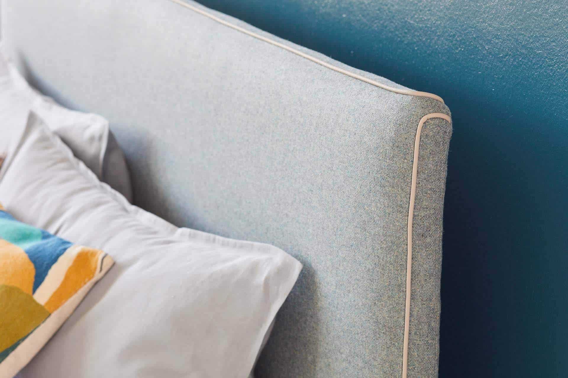 - Testiera morbidamente imbottita con profilo in listello di cuoio