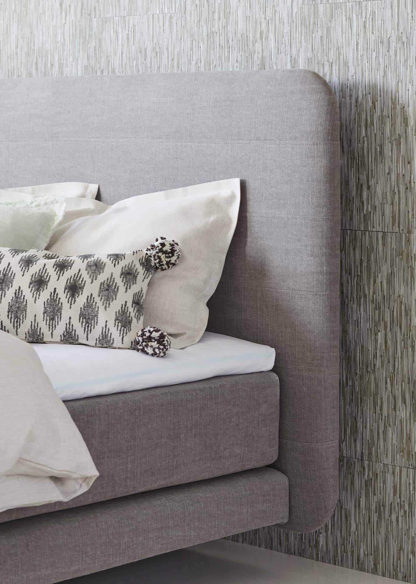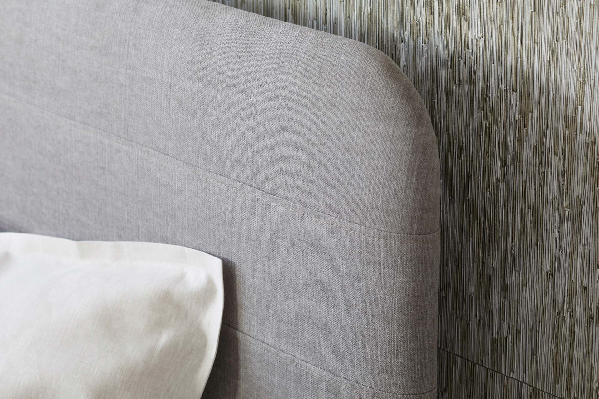 Letto boxspring armonioso con angoli dolcemente arrotondati e cuciture decorative orizzontali.
